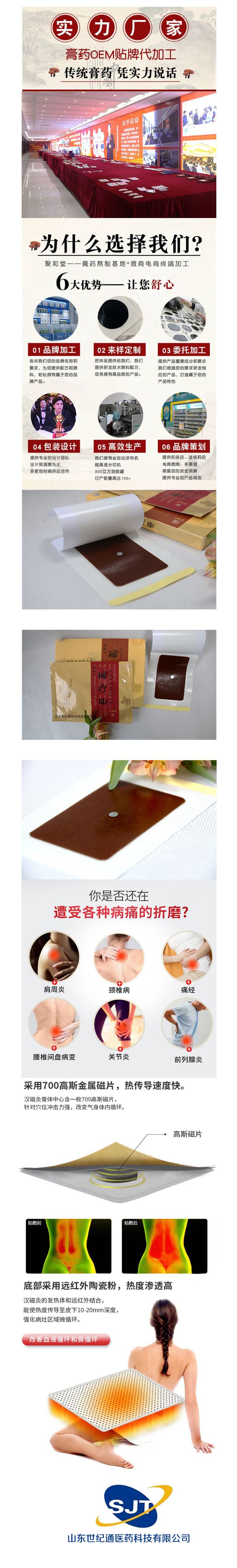 | 补充说明 | 山东世纪通医药科技有限公司一家集贴膏、医疗器械、化妆品、保健食品、生物试剂新药研发生产与销售、房产开发、物流配送、企业培训为一体的大型综合型企业集团。质量可靠,资质齐全,一站式医疗器械OEM贴牌代工,承接批发代理! |