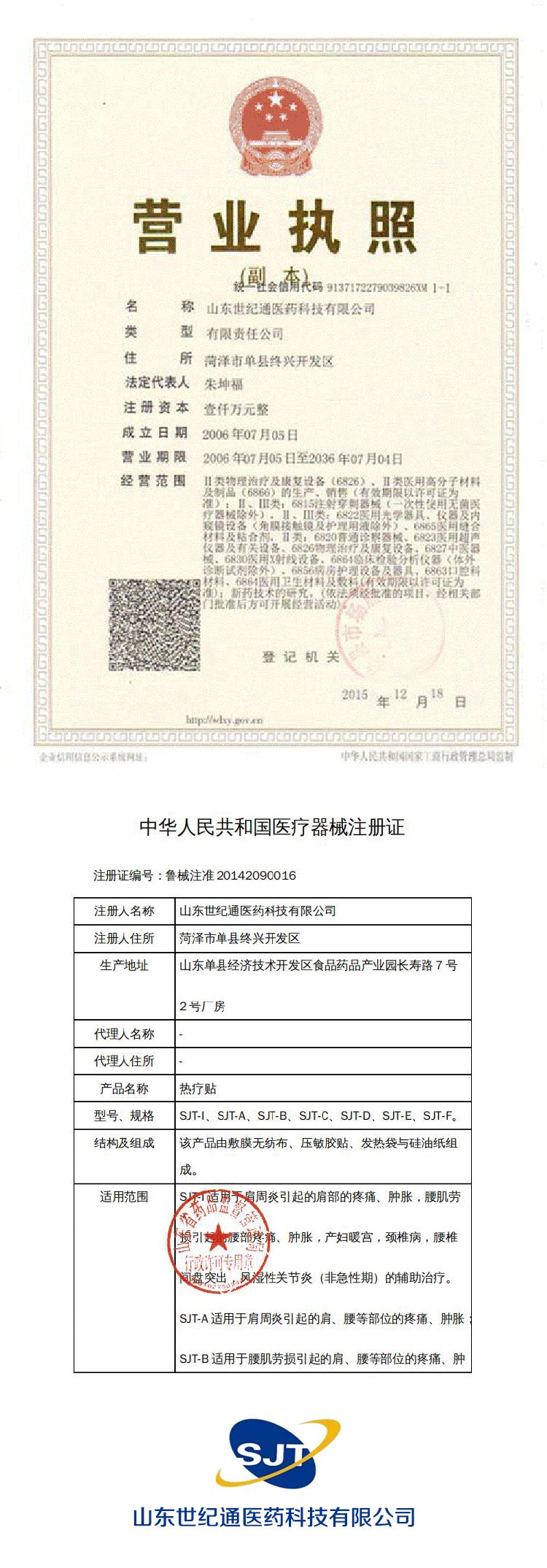 | 补充说明 | 山东世纪通医药科技有限公司有几十种一类、二类械字号文号,现有产品也有上百种,合作客户也是遍布全国各地,膏药贴剂、保健食品、高端化妆品系列全国招商,我们为了扩大市场,与更多客户合作,也希望有新型外用产品规格定制加工要求、贴牌加工的客户联系庞龙:18888366188。我们给您专业的产品和服务。 |