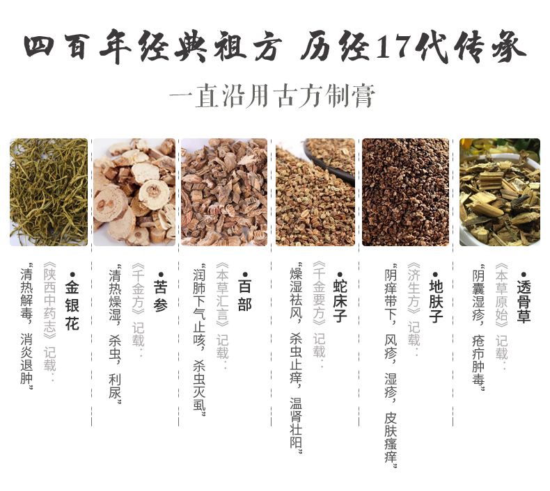 | 主要成分 | 透骨草、苦参、黄柏、薄荷、地肤子、蛇床子、蝉蜕、羚羊角、金银花、百部、猪牙皂、地榆、三颗针、白鲜皮、何首乌、夜交藤、樟脑、冰片、水杨酸。 |