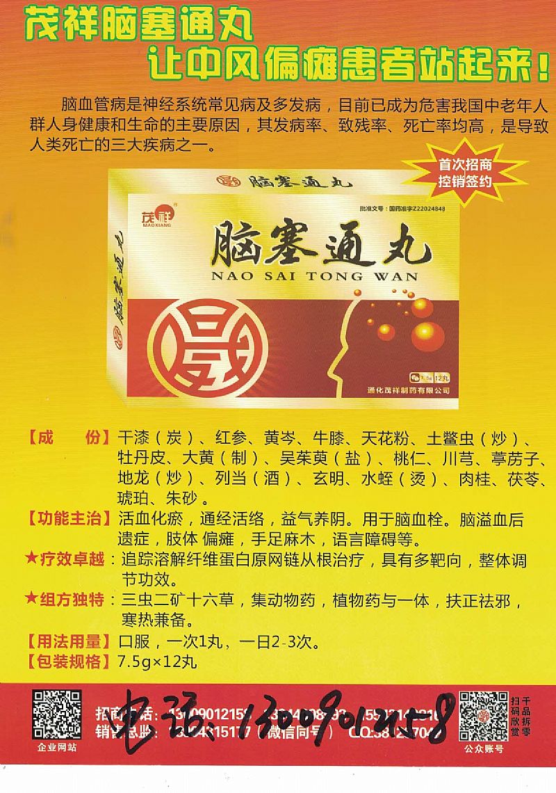 | 补充说明 | 脑塞通丸这是一种口服的中成药制剂,主要具有活血化瘀、活血通经的功效。在临床上主要治疗脑血栓、脑栓塞、脑梗死、脑出血后遗症导致的肢体偏瘫、半身不遂、手足麻木、言语不清、口眼歪斜、流口水、动脉硬化、高血压、高脂血症、高血黏度等。 脑塞通丸的主要成分主要有红参、黄芩、牛膝、天花粉、丹皮、大黄、吴茱萸、桃仁、川芎、葶苈子、地龙、地黄、水蛭、肉桂、茯苓、朱砂等药物。服用本药时饮食要注意清淡。 服药期间需同时进行肢体、语言功能锻炼,有助于神经功能缺损症状恢复。患者在服药期间需要多吃新鲜的水果蔬菜和富含维生素的食物,不能吃辛辣刺激性的食物和油腻的食物,要多注意休息,不能熬夜,避免疲劳过度。对本品过敏者禁用,有过敏体质者慎用。 以上方案仅供参考,具体药品使用请结合自身情况在专业医生指导下用药。 |