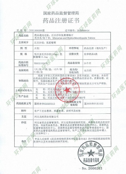 | 产品规格 | 每片含厄贝沙坦150mg和氢氯噻嗪12.5mg。 |