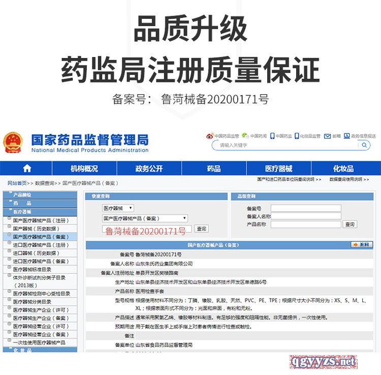 | 补充说明 | 【产品名称】医用检查手套 【型号规格】PVC手套 XS、S、M、L、XL; 【产品描述】通常采用聚乙烯、橡胶等材料制造。有足够的强度和阻隔性能。非无菌提供,一次性使用。 【预期用途】用于戴在医生手上对患者病情进行检查或触检。 【使用方法】戴手套前,取下**手上饰品,并将指甲修剪平滑。按手术消毒通用规范对手部清洁,消毒和干燥,穿戴适合个人手型规格的手套,湿手会增加穿戴难度。 【注意事项】1、穿戴手套时,不得戴戒指或其他饰物,并将指甲修剪平滑。 2、不分左右手穿戴,请选择适合本人手型规格的手套。 3、如发生包装破损造成手套污染,请勿使用。 4、本产品仅供一次性使用,用后请销毁。 5、严禁接触油、酸、碱、铜、锰等对橡胶有害的金属和化学药物; 6、对聚乙烯制品使用有过敏史者慎用。 7、温度过高会对塑胶手套产生很大的破坏性。 【备案号】鲁菏械备20200171号 【生产企业】山东朱氏药业集团有限公司 |