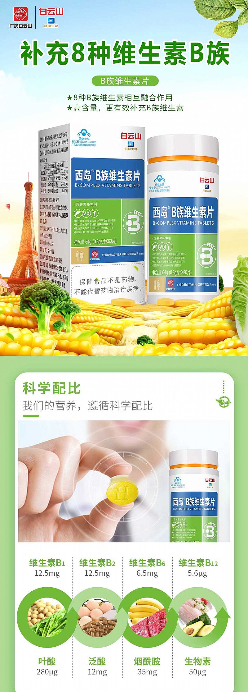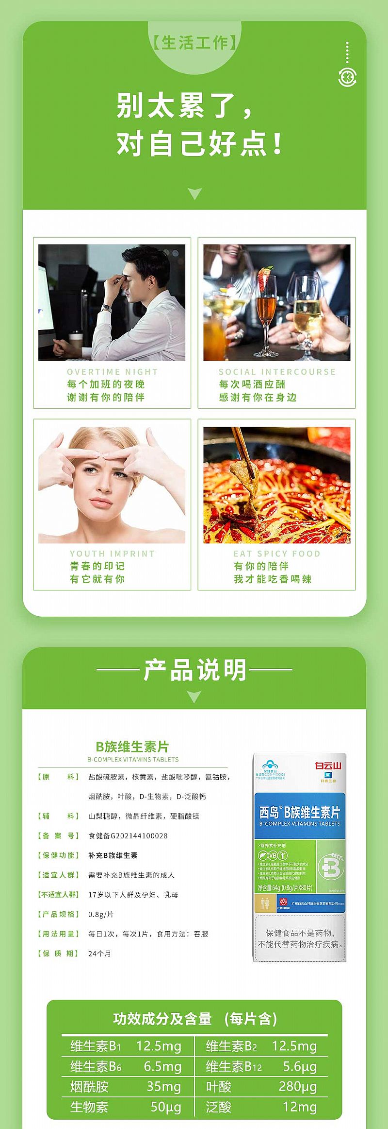 | 产品卖点 | 8种B族维生素相互融合作用,高含量,更有效补充B族维生素。 |