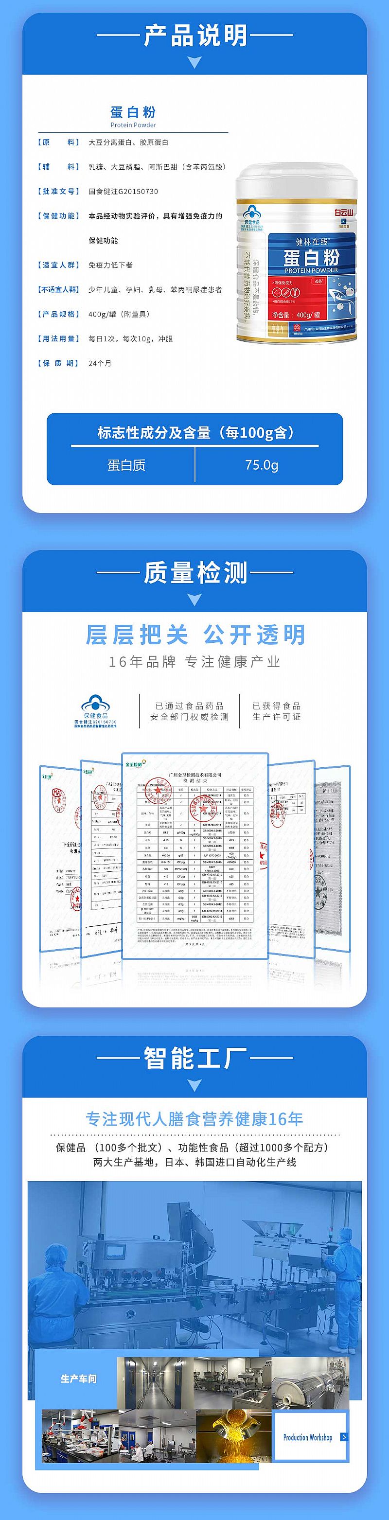 | 补充说明 | 营养知识:蛋白质是生命的物质基础,是人体所需的营养素,人体**组织细胞都由蛋白质构成,它的存在与生命的**活动紧密联系,参与机体的代谢以及遗传信息构成和代谢。本品采用优质动植物双蛋白配方,克服了单一植物蛋白中营养素不充分的缺点,含人体所必需而自身又无法合成的氨基酸,可增强机体免疫力;本品所含的胶原蛋白可促进皮肤伤口愈合,也可预防骨钙流失,预防或改善骨质疏松。 建议服用人群: ☆身体抵抗力差、术后康复者; ☆消化功能低下者; ☆爱好运动、减肥瘦身、增肌者; ☆皮肤粗糙、松弛者; 营养师建议:本品与B族维生素搭配有助于促进人体对蛋白质的吸收利用,预防上火。 |