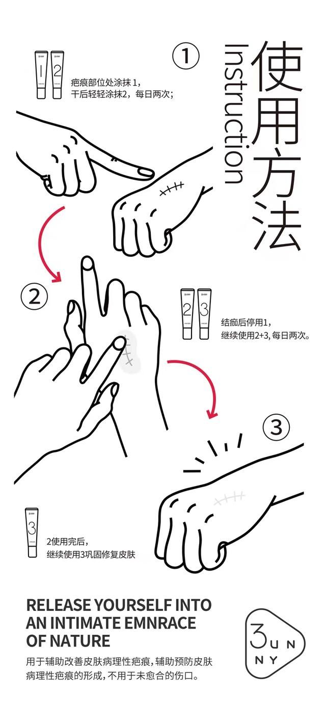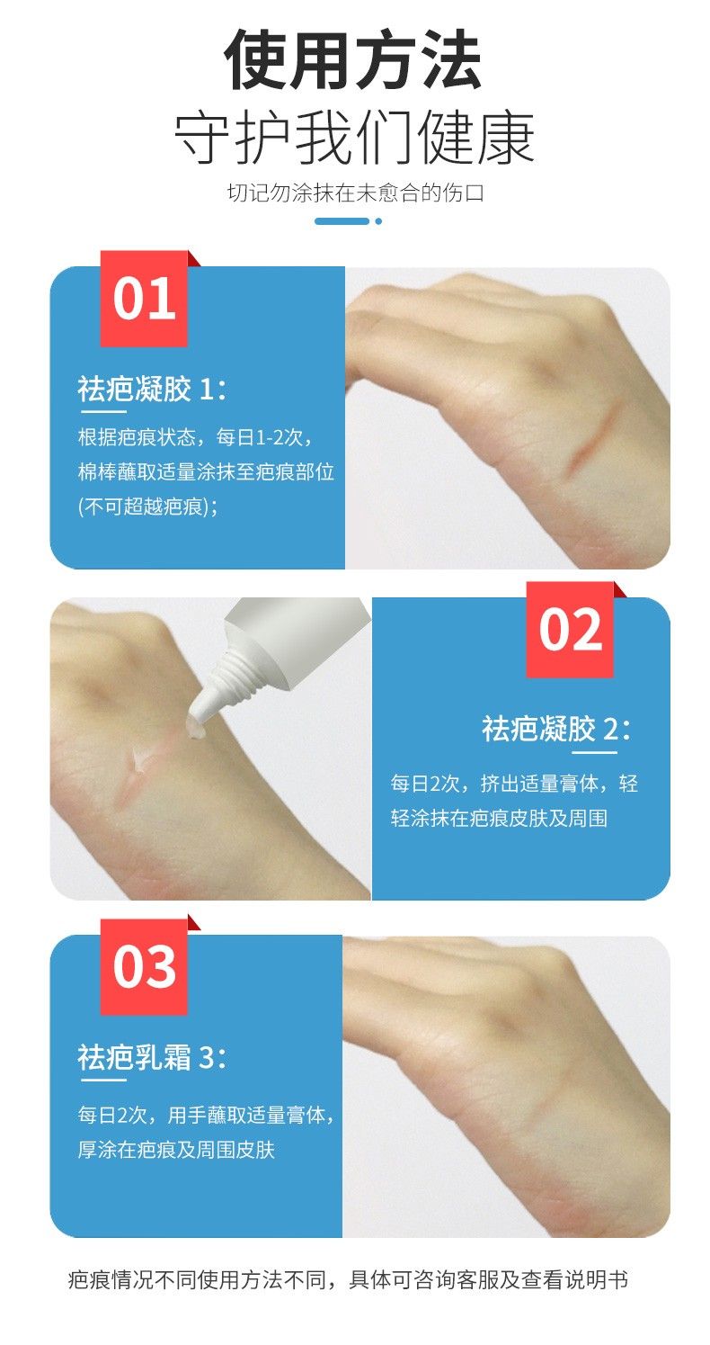 | 使用方法 | 将适量疤痕凝胶涂抹在患处,用手指轻揉3-5分钟,每日二至四次或遵医嘱。烧伤、外伤、手术后早期使用效果更好 |