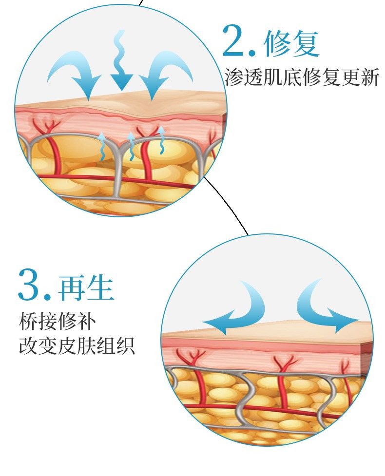 | 作用机理 | 1、软化增生角质层 2、修复渗透肌层修复更新 3、再生桥接修补改善皮肤组织 |