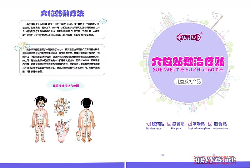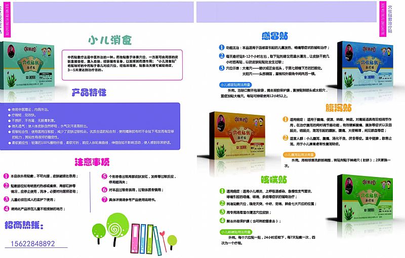 | 补充说明 | 小儿穴位治疗敷贴治疗贴(感冒贴) 小儿穴位治疗敷贴治疗贴(腹泻贴) 小儿穴位治疗敷贴治疗贴(消食健脾贴) 小儿穴位治疗敷贴治疗贴(咳嗽哮喘贴) |