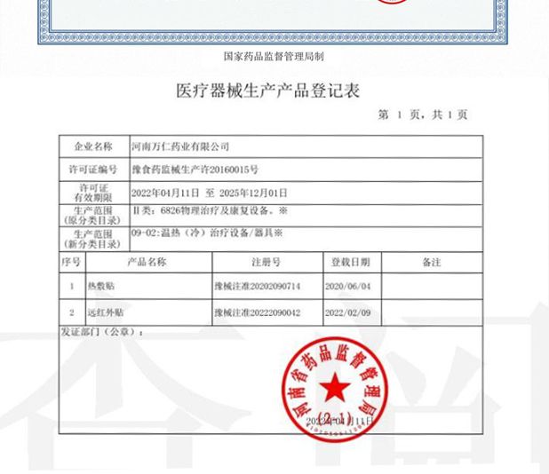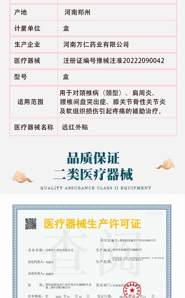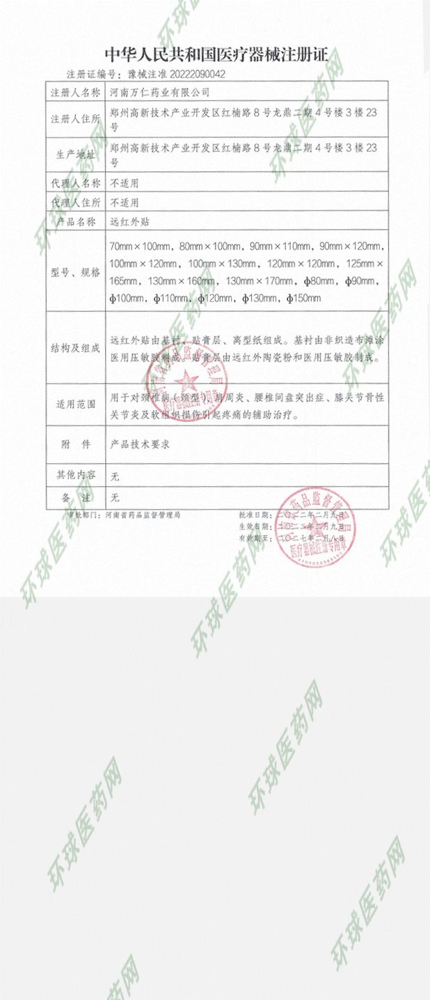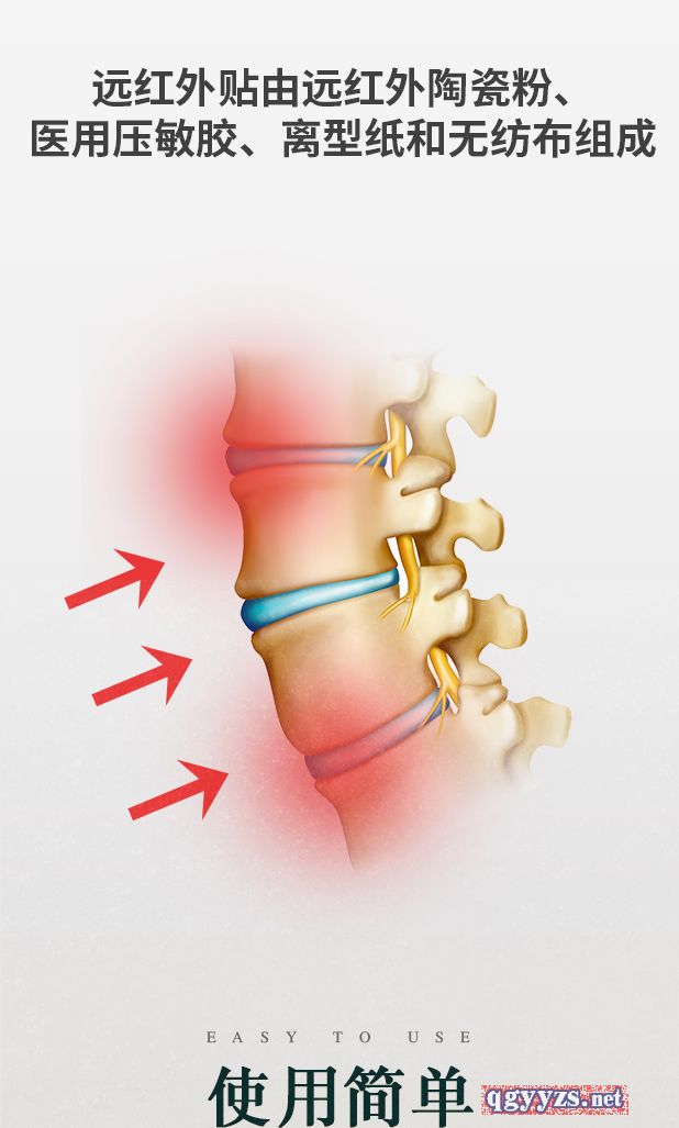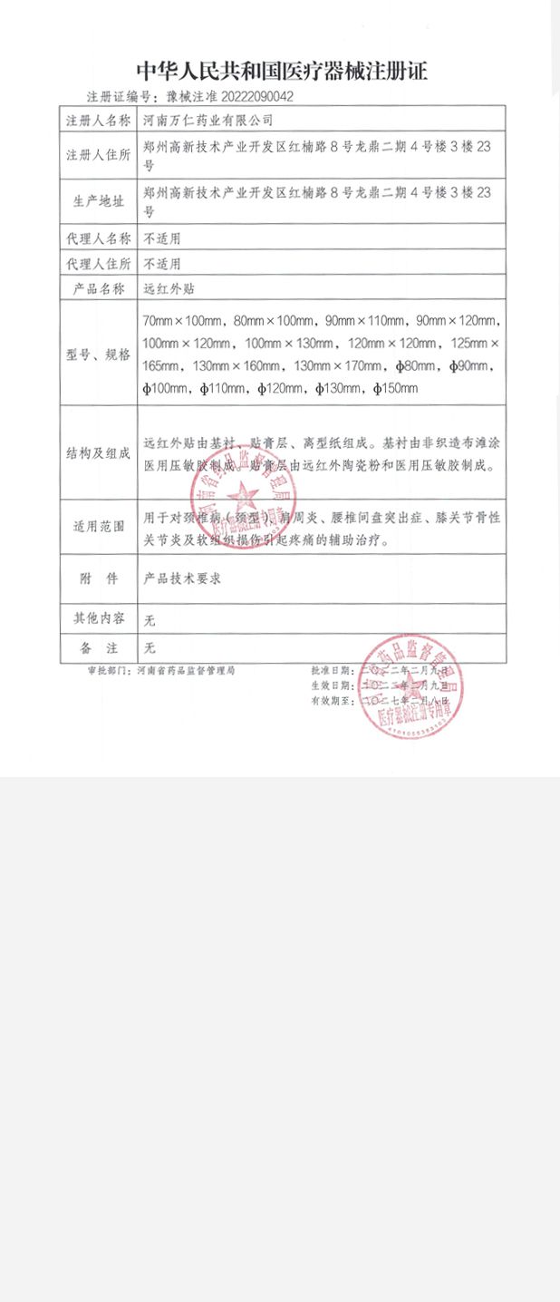 | 产品卖点 | 远红外贴属于二类医疗器械,由基衬,贴膏层,离型纸组成。基衬由非织造布滩涂医用压敏胶制成。贴膏层由远红外陶瓷粉和医用压敏胶制成。用于对颈椎病(颈型),肩周炎,腰椎间盘突出症,膝关节骨性关节炎及软组织损伤引起疼痛的辅助治疗。 |