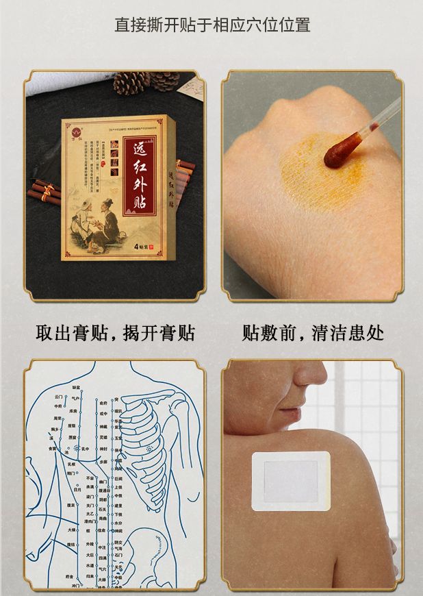 | 使用方法 | 将皮肤洗净擦干,打开包装,取药贴贴敷在疼痛处或相应穴位上,每日一贴。每隔4小时取下封于自封袋内密闭封存,1小时后再淘贴敷,直至产品停止发热为止 |