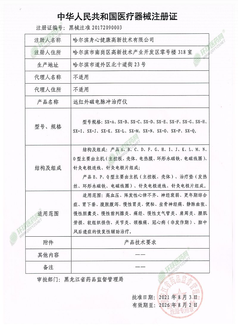 | 产品用途 | 高血压、阵发性心律不齐、神经衰弱、更年期综合症、胃下垂、腹胀腹泻、慢性胃炎、便秘、坐骨神经痛、静脉曲张、慢性胆囊炎、慢性前列腺炎、痛经、慢性支气管炎、肩周炎、腰肌劳损、软组织损伤、关节炎、颈椎痛、冠心病(非发作期)、脑中风后遗症的恢复性辅助治疗。 |