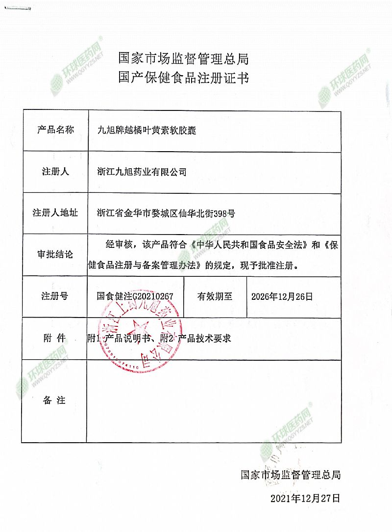 | 补充说明 | 品名:九旭牌越橘叶黄素软胶囊 原料:越橘提取物,叶黄素 辅料:玉米油,明胶,纯化水,甘油,蜂蜡 适宜人群:视力易疲劳者 不适宜人群:少年儿童,孕妇,乳母 执行标准:q/jxs 0206s 注意事项:本品不能代替药物,适宜人群外的人群不推荐使用 生产商:浙江九旭药业有限公司 地址:浙江省金华市婺城区仙华北街398号 |