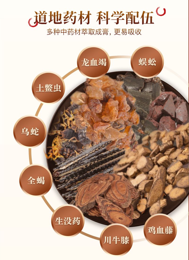 | 主要成分 | 本品是以龙血竭、乌蛇、细辛、蜈蚣、全蝎、土鳖虫、肉桂、生乳香、生没药、牛角粉、樟脑、冰片、三七粉、威灵仙、七叶一枝花、桂枝、鸡血藤、红花、当归、川芎、生地、羌活、独活、蓁艽、防风、三棱、莪术、透骨草、木瓜、伸筋草、寻骨风、干姜、急性子、川牛膝、九里香为主要原料,经特定工艺加工而成。 |