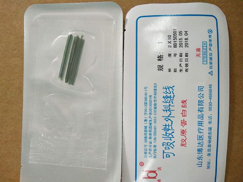 | 补充说明 | 型号规格:规格型号:产品分为带针缝合线与不带针缝合线两种。缝合线规格型号:9-0、8-0、7-0、6-0、5-0、4-0、3-0、2-0、0、1、2、3、4。缝合线长度:2cm、5cm、10cm、20cm、30cm、45cm、60cm、70cm、75cm、90cm、100cm、125cm、150cm、200cm。缝合针类型:圆、三角、短刃三角、铲型、钝、铲型针;按针体弯曲弧度分别有1/4弧、3/8弧、1/2弧、3/4弧、5/8弧、半弯,直针。缝合针长度:6mm、11mm、12mm、13mm、15mm、16mm、17mm、18mm、19mm、20mm、22mm、24mm、26mm、27mm、28mm、31mm、36mm、37mm、38mm、40mm、44mm、50mm、52mm。缝合针直径:0.2~1.3mm。 结构及组成/主要组成成分:可吸收性外科缝线由健康青山羊肠衣中的胶原蛋白加工制成,肠衣中的主要成分是胶原蛋白,在人体内经酶解后被组织吸收。为铬制和平制缝线,包装袋内有异丙醇保存液。缝合针基本材料为3Cr13不锈钢丝。分带针与不带针两种。γ射线灭菌。 |