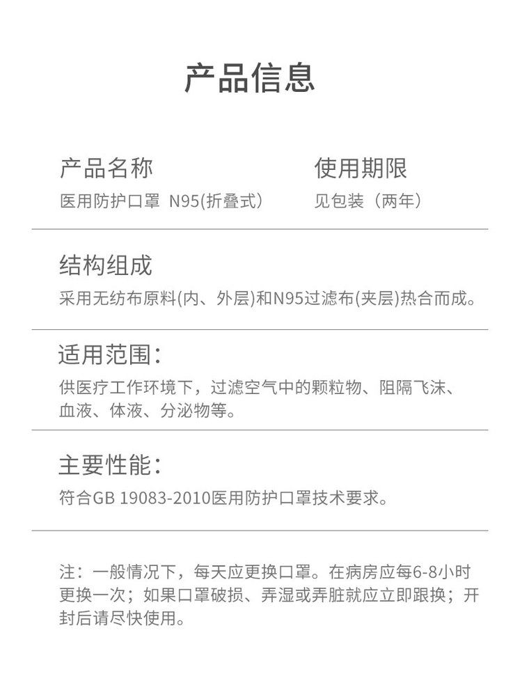 | 使用方法 | 1.打开产品包装,取出口罩,将有鼻夹一端向上,有包边一面朝外,轻拉耳带将口罩挂于双耳,应避免手部接触口罩内侧。 2.轻按鼻夹使其与鼻梁贴合,然后按住鼻夹。将口罩下端向下拉至下颌处,使折叠边完全展开。 3.整理口罩佩戴效果,使口罩能罩住使用者的鼻、口至下颌并保证口罩的密闭性。 |