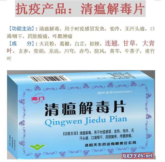 | 功能主治 | 清瘟解毒。用于时疫感冒,发热,怕冷,无汗头痛,口渴咽干,四肢酸痛,痄腮肿痛。 |