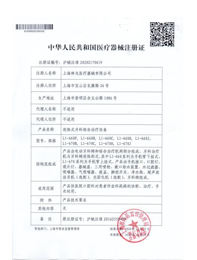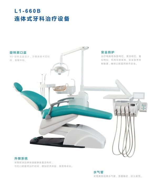 | 主要成分 | 产品由电动牙科椅和综合治疗机两部分组成,牙科治疗机与牙科椅连体形式。其中L1-660系列为手机管下挂式、L1-670系列为手机管上挂式。产品由手机接口、口腔灯、观片灯、器械盘、三用喷枪、漱口给水装置、水过滤器、吸唾器、气吸唾器、痰盂、脚控开关、净水瓶、超声波洁牙机(选配)、光固化机(选配)、牙科椅组成。 |