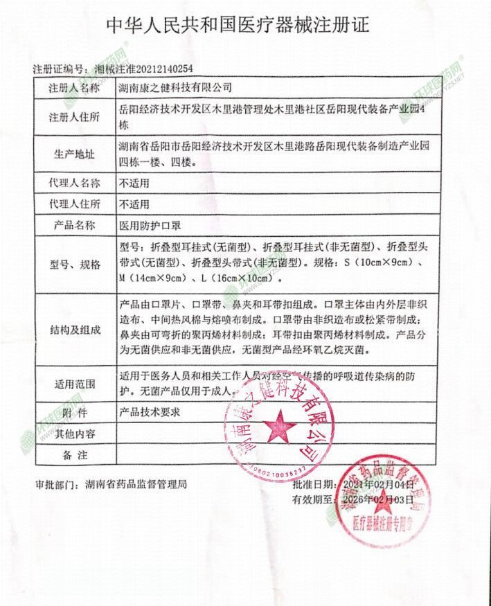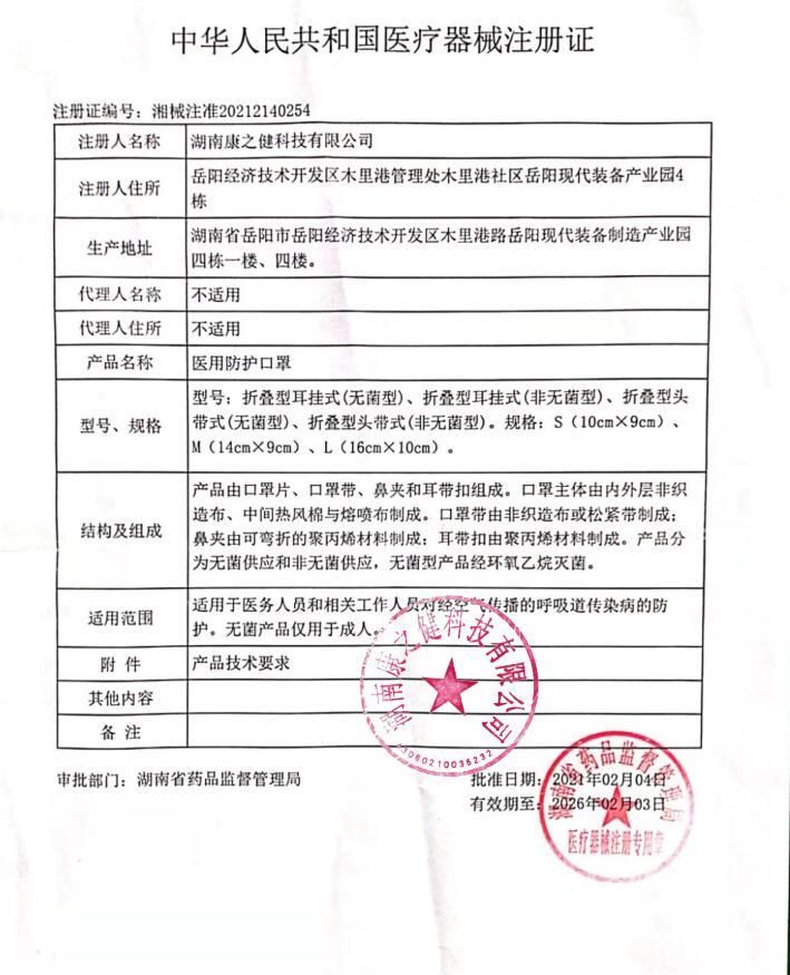 | 主要成分 | 产品由口罩片、口罩带、鼻夹和耳带扣组成。口罩主体由内外层非织造布、中间热风棉与熔喷布制成。口罩带由非织造布或松紧带制成;鼻夹由可弯折的聚丙烯材料制成;耳带扣由聚丙烯材料制成。产品分为无菌供应和非无菌供应,无菌型产品经环氧乙烷灭菌。 |