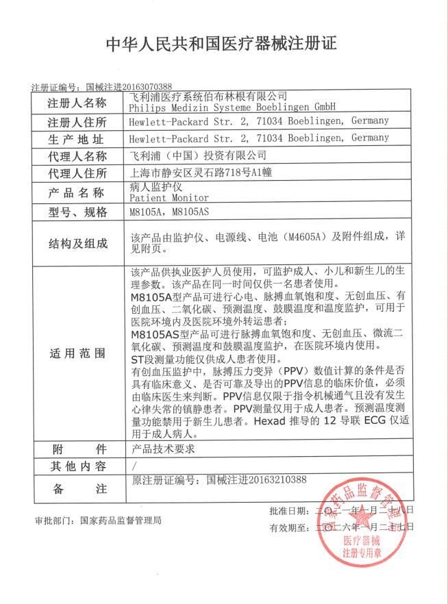 | 主要成分 | 该产品由监护仪、电源线、电池(M4605A)及附件组成,详见附页。 |