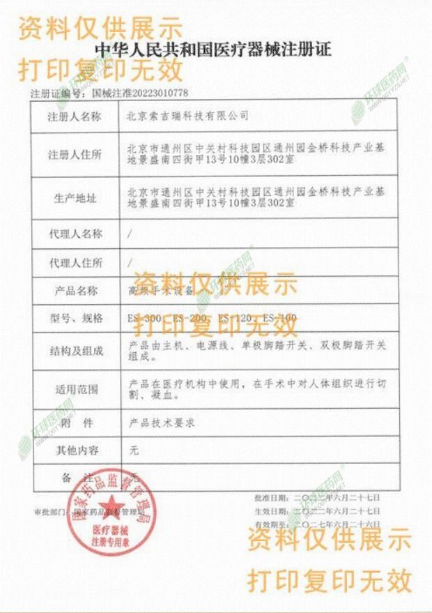 | 英文名称 | Suojirui high frequency surgical equipment ES-100 |