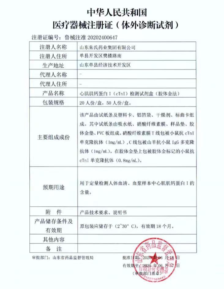 | 其它说明 | 【药品名称】通用名称:心肌肌钙蛋白Ⅰ检测试剂盒(胶体金法) 汉语拼音:XinJiJiGaiDanBaiⅠJianCeShiJiHe(JiaoTiJinFa) 【成份】心肌肌钙蛋白Ⅰ检测试剂盒(胶体金法)主要组成成分:试剂盒内含10人份或25人份或50人份及一份说明书;每人份为一单独的检测盒,由检测卡、试剂条、干燥剂、采样滴管和密封袋组成。检测卡由塑料卡扣与试剂条组成;试剂条由PVC板、样品垫、胶体金垫(喷有由胶体金标记的鼠抗人cTnI单克隆抗体)、硝酸纤维素膜(T线包被有羊抗人cTnI多克隆抗体,C线包被有羊抗鼠IgG抗体)、吸水纸组成。 【适应症】用于临床体外定量检测人体全血、血浆或血清中心肌肌钙蛋白I(cTnI)的含量。 【规格】10人份/盒、25人份/盒、50人份/盒 |