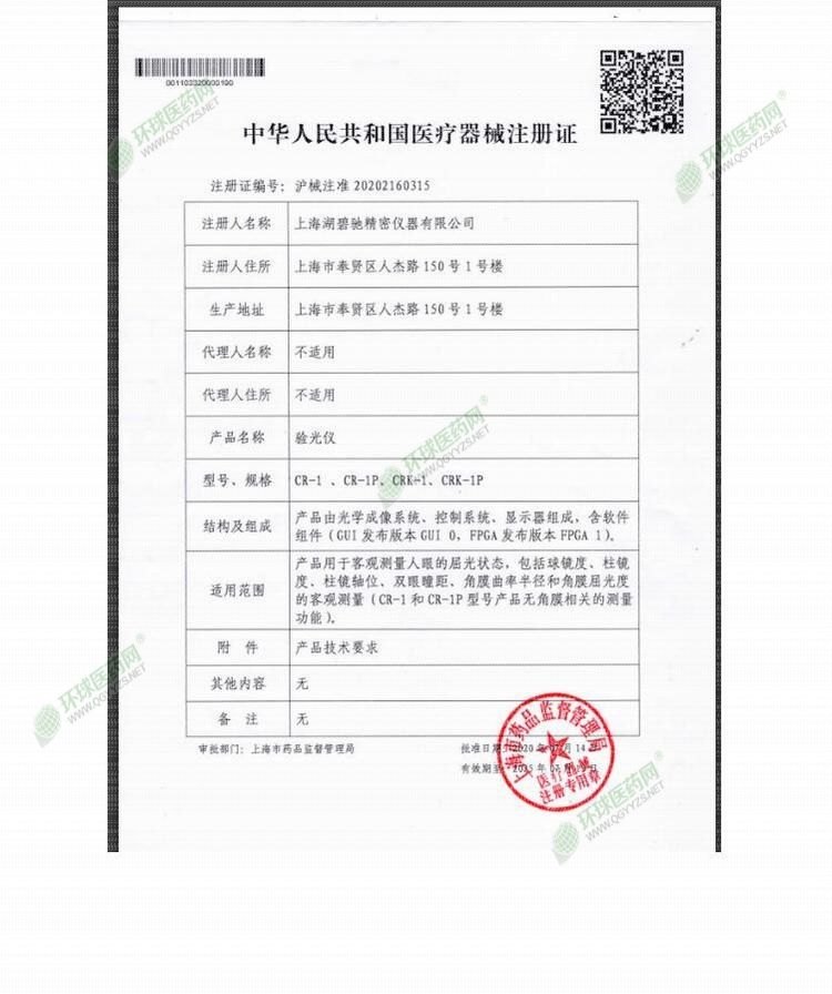 | 补充说明 | 注册证号 沪械注准20202160315 适用范围 产品适用于对被测试者眼睛的球精度、柱镜度、柱镜轴位、双眼瞳距、角膜曲率半径和角膜屈光度的客观测量(CR-8800型产品无角膜相关的测量功能)。 结构及组成 产品由主机(软件信息详见附页)、热敏式打印机、显示器组成。 |