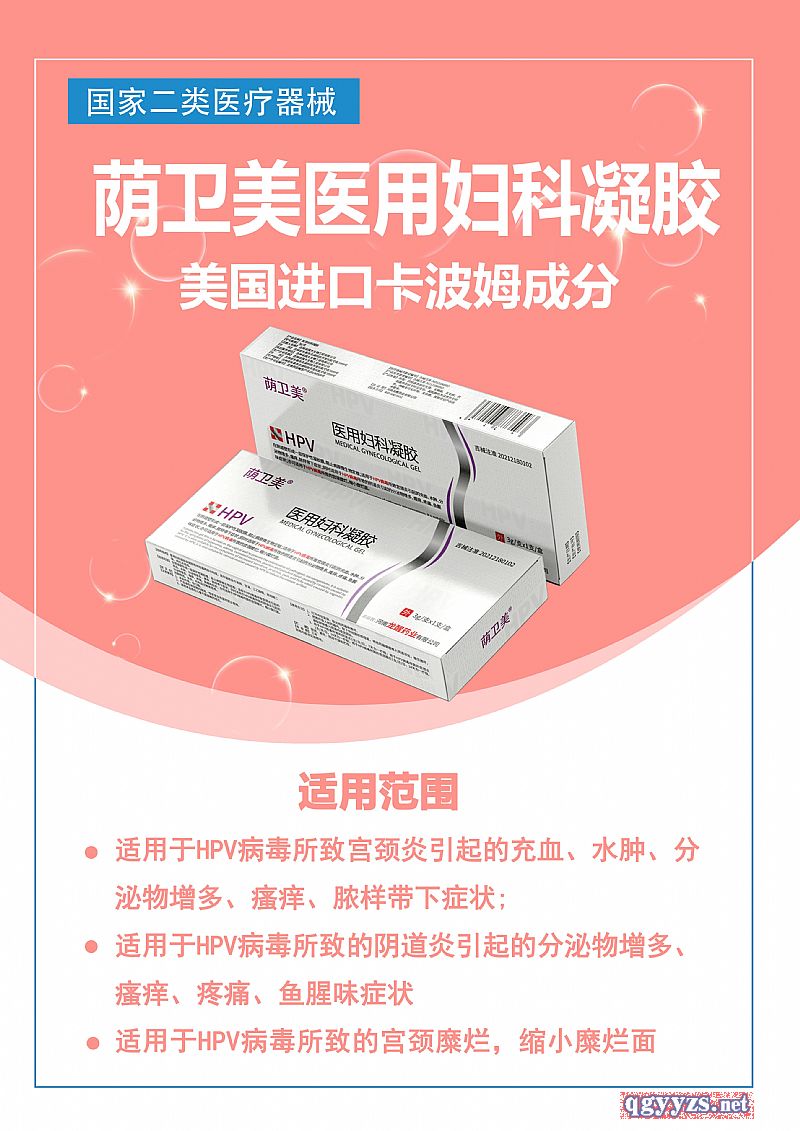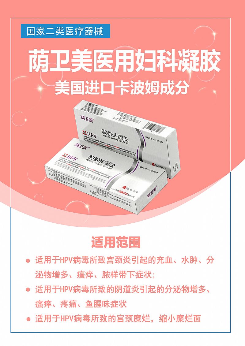 | 产品用途 | 适用于HPV病毒所致宫颈炎引起的充血、水肿、分泌物增多、瘙痒、脓样带下症状;同时适用于HPV病毒所致的阴道炎引起的分泌物增多、瘙痒、疼痛、鱼腥味症状;亦可适用于HPV病毒所致的宫颈糜烂,缩小糜烂面。 |