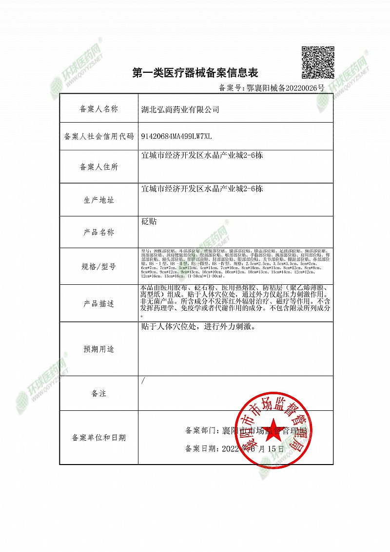 | 补充说明 | 【产品描述】本品由医用胶布、砭石粉、医用热熔胶、防粘层(聚乙烯薄膜、离型纸)组成。贴于人体穴位处,通过外力仅起压力刺激作用。非无菌产品。所含成分不发挥红外辐射治疗、磁疗等作用。不含发挥药理学、免疫学或者代谢作用的成分。不包含附录所列成分。 【预期用途】贴于人体穴位处,进行外力刺激。 【适用范围】本品针对阿是穴的刺激作用,对颈椎、肩周、腰椎、腿部等部位不适起辅助理疗作用。 |