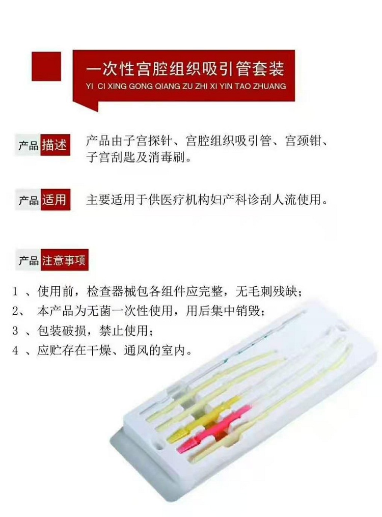 | 补充说明 | 一次性宫腔组织吸引管俗称一次性人流管、微管,质地光滑、有弹性,对怀孕早期孕囊极小的手术,可直接用抗早早孕软管探入宫腔吸取孕囊,将早早孕手术提前了十几天,提前解除意外怀孕女性的苦恼,减少早孕现象持续时间。套装产品即一次性人流包,一般包含两根吸引管,两根扩宫棒和子宫探针。 型号规格:TZ-3、 TZ-4、TZ-5 结构组成:产品由一次性宫腔组织吸引管、一次性使用宫颈扩张棒、一次性使用子宫探针组成,主要采用医用PE制成。 性能要求:套装经过环氧乙烷灭菌,产品应无菌,环氧乙烷残留量应不大于10ug/g. 使用说明: 1.使用本品前应核定早孕日期方可使用 2.与吸引器配套使用,使用时先以探针探测宫腔深度,再用扩张棒缓缓张开宫颈,将吸引管与吸引器连接,此时给予负压,吸引管与吸引器接头处折叠,沿子宫方向缓缓插入宫颈后将折叠处松开,将吸引管沿顺时针或逆时针方向在宫腔内反复移动,吸引胚胎及胎盘组织,可以多次重复,观察所吸取的胚胎组织,胚囊完整或已达到终止妊娠目的的即停止手术。 |