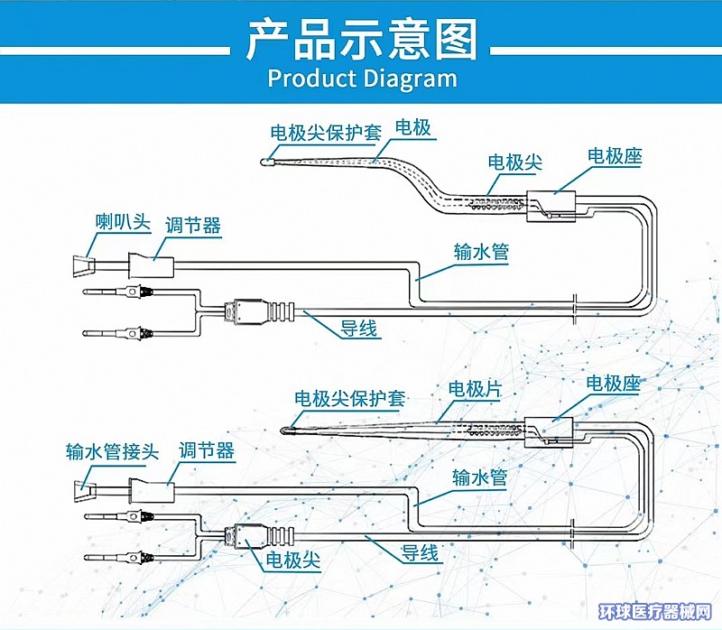 | 补充说明 | 【产品结构组成及性能】消融电极由电极片、电极座、导线、插头、输水管、调节器、输水管接头、限位块和电极尖保护套组成,其中输水管和调节器为可选配部件。产品出水方式为双侧滴水。产品应无菌。 【适用范围】消融电极与高频仪器配套使用,供临床各类外科手术非内窥镜下对组织进行电切、电凝、消融,达到止血的目的。 【使用说明】 1、根据临床需要,选择相应规格型号的消融电极产品; 2、取出无菌小包装,从启口处撕开,取出,脱去护套,顺理、将输水管与生理盐水瓶有效连接,用专用连接线接通高频机电源,调节输水流量调节器,放水1分钟,进入正常使用状态待用;手术过程中应及时用纱布抹去镊尖上的组织附着物,确保滴水口畅通; 3、整个手术过程中,应严格执行无菌操作和相关操作规程,并注意观察病人体征; |