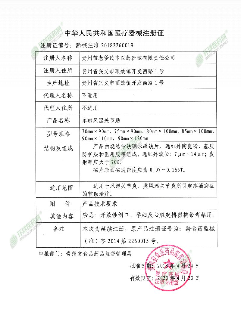 | 补充说明 | 1、使用本品,若个别皮肤出现瘙痒或皮疹,应立即停止使用即可。 2、使用或存放本品时应远离磁卡和易受磁损坏物品;不要与带金属仪表的器械同时使用。 3、开放性伤口、孕妇、儿童、心脏起搏器携带者和对磁疗有明显不良反应者禁用。 4、置于干燥通风处保存。 【售后服务单位】贵州苗老爹民本医药器械有限责任公司 【注册人住所】贵州省兴义市顶效镇开发西路1号 |