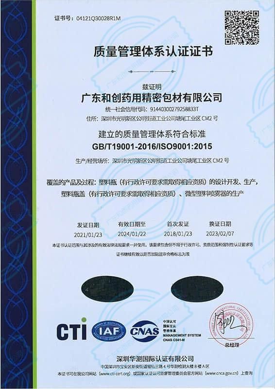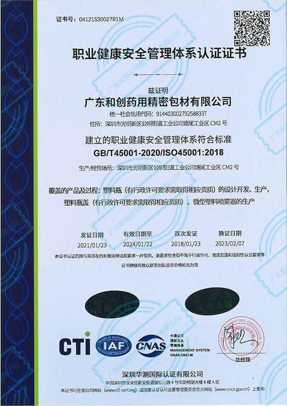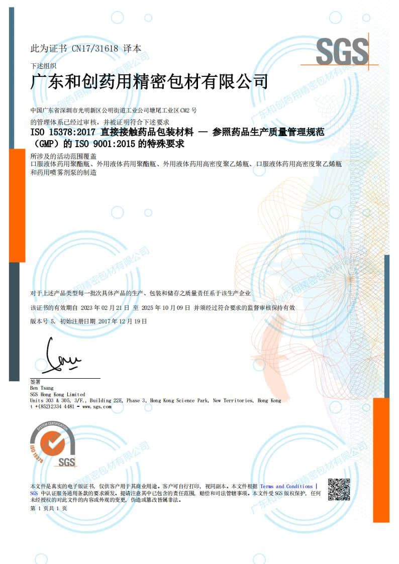 | 产品卖点 | 广东和创已通过ISO9001质量管理体系认证、ISO14001环境管理体系认证、ISO45001职业健康管理体系认证和ISO15378-2017药包材质量管理体系认证。 |
