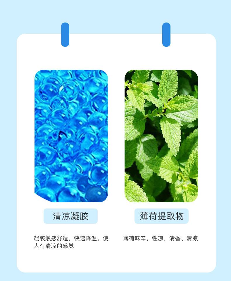 | 主要成分 | 由水、甘油、聚丙烯酸钠、甘氨酸铝、乙二胺四乙酸二钠、酒石酸,DMDM乙内酰脲、亮蓝和各种形式的无纺布背衬层、凝胶层、聚乙烯薄膜覆盖层组成。降温物质不含有发挥药理学、免疫学或者代谢作用的成分,不包含附录所列成分。非无菌产品。 |