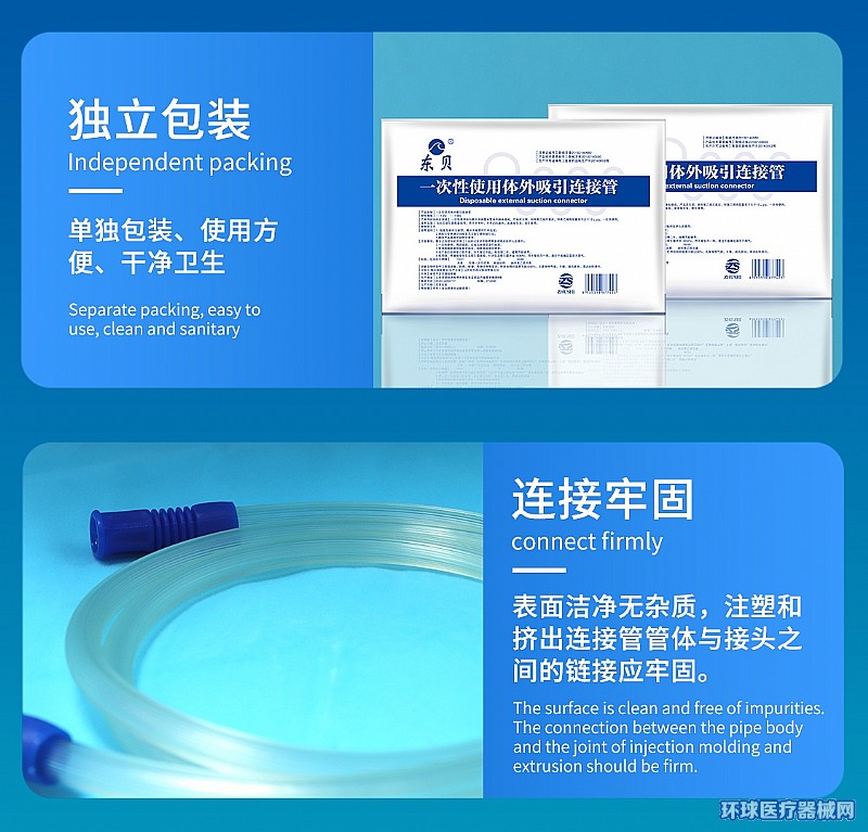 | 产品卖点 | 一次性使用体外吸引连接管由管身和接头组成,产品应无菌,经环氧乙烷灭菌后,环氧乙烷残留量应不大于10μg/g。一次性使用。 |