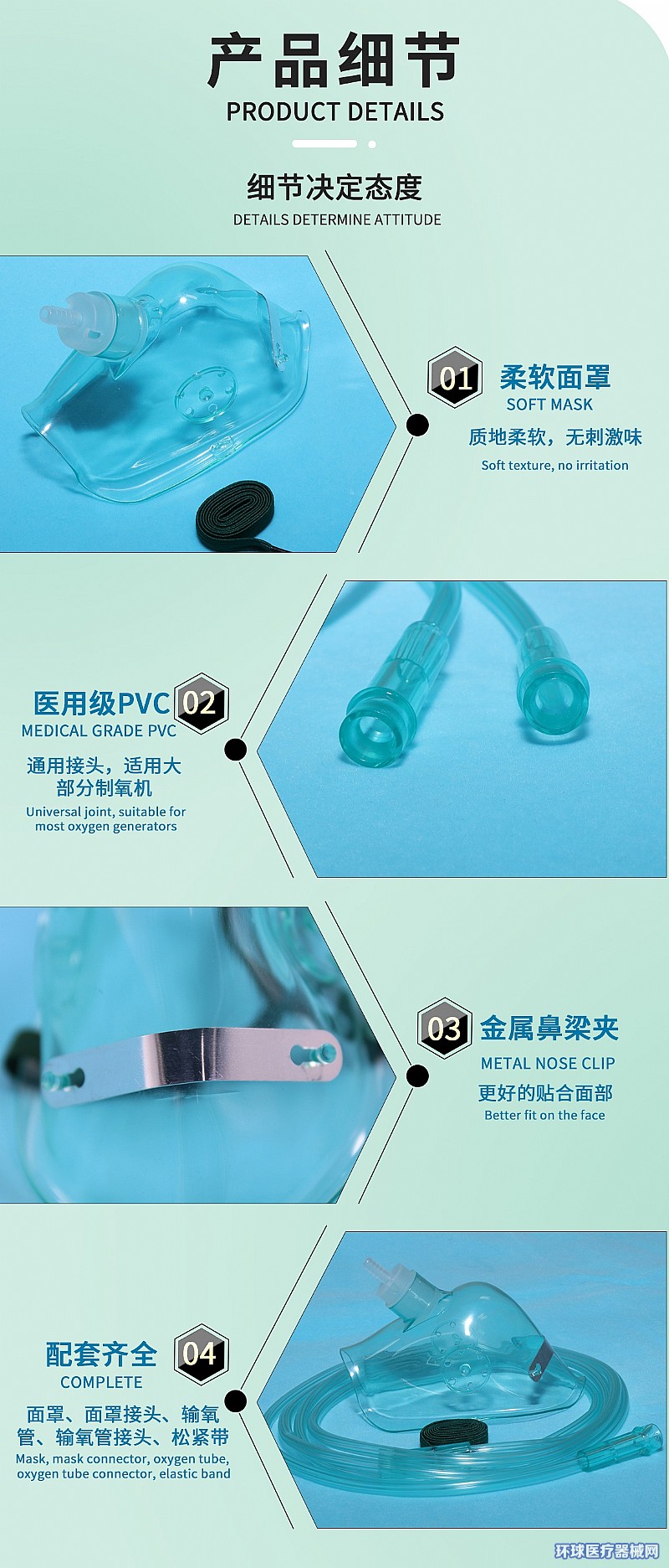 | 产品卖点 | 1、医用级PVC输氧管 2、12个排气孔,及时排出呼出的二氧化碳; 3、2米加长吸氧管,通用接口。适合市场上大部分制氧机 |