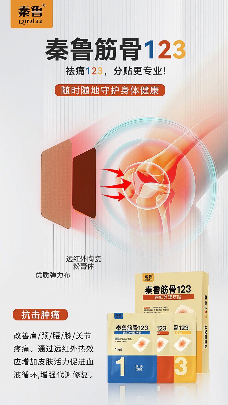 | 补充说明 | 无论是上班族、体力劳动者、运动爱好者,还是中老年人、家庭主妇、产后妈妈,针对腰腿痛、颈肩痛、关节肿痛均可采用123分贴疗法缓解巩固病情。分贴去痛的方式,便于患者对疼痛缓解、巩固过程的感知,也体现了品牌坚持创新发展战略,以市场需求为核心,以产品创新为先导的用心。秦鲁筋骨123通过技术、设计创新拉动了贴膏消费增长,以秦鲁筋骨123为首的分贴技术将成为行业学习和发展的趋势 |