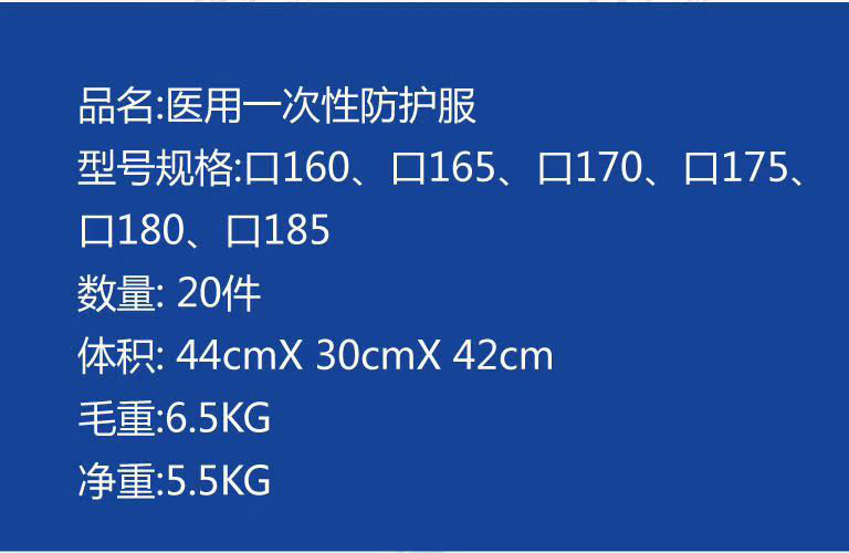 | 补充说明 | 【注意事项,警示及提示性说明】 1,本产品为无函、一次性使用产品,有效期三年; 2、本产品只限于一次性使用,打开包装后应立即使用,使用时间不超过24小时,用后应焚烧处理。 3,穿着前如发现破损或拉链、缝线等任何部位有不妥之处,则不可使用 4,防护报应避免长时间与化学物质按触。 5、本产品无阻燃性。 【贮存条件和方法】 本产品应贮 在无腐蚀性气体、干燥、避绝日晒、通风条件良好、清流的环墙内,远离明火。 |