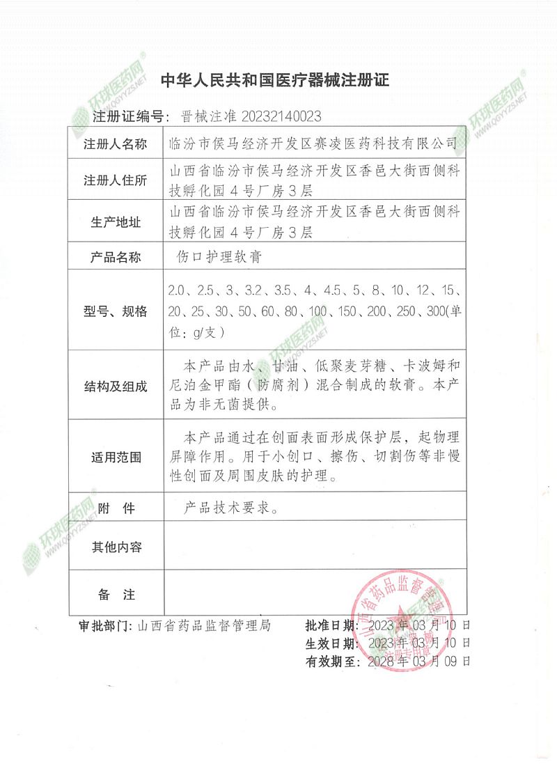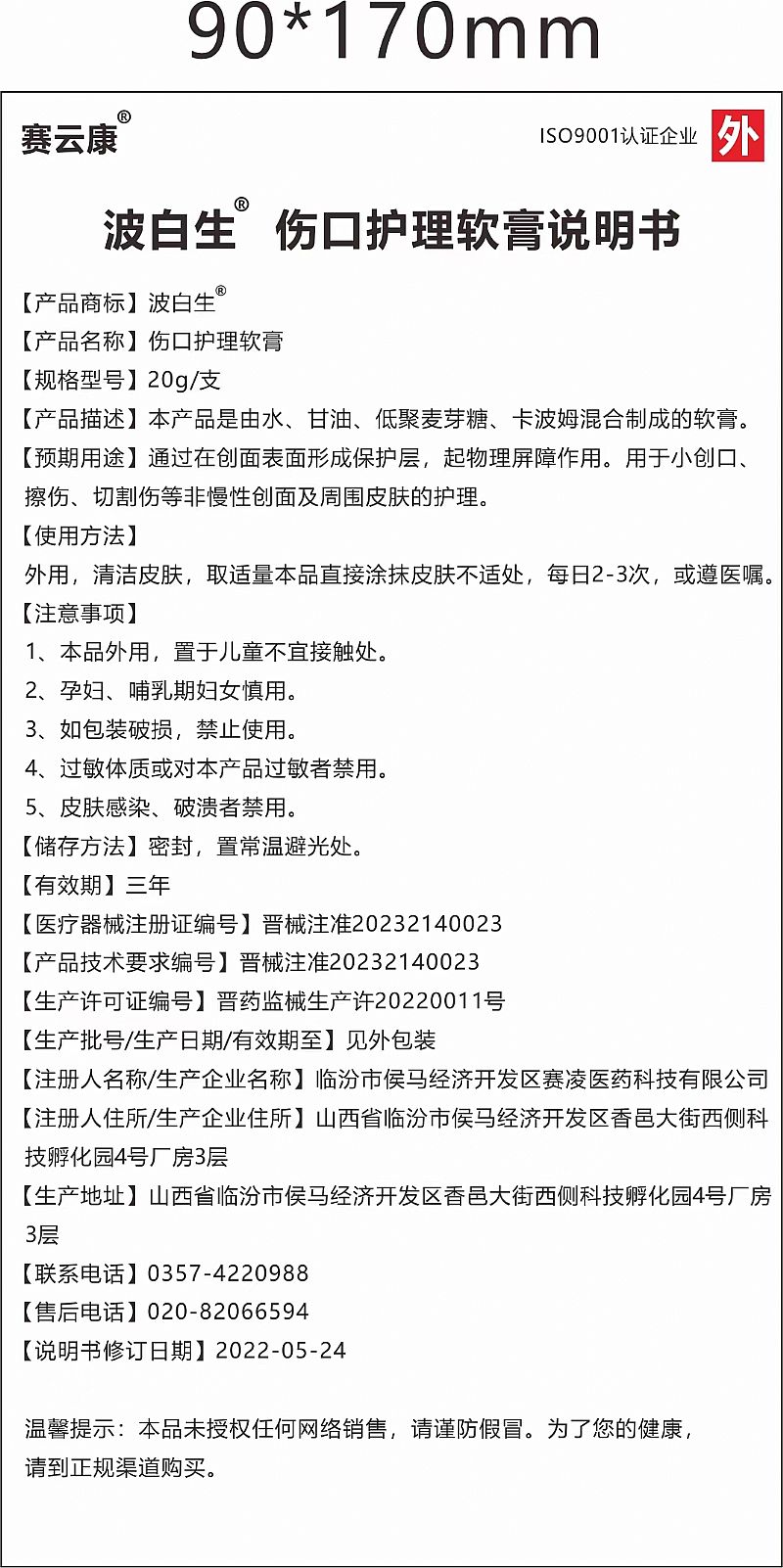 | 补充说明 | [产品商标]波白生 [产品名称]伤口护理软膏 [规格型号]20g/支 [产品描述]本产品是由水、甘油、低聚麦芽糖、卡波姆混合制成的软膏 [预期用途]通过在创面表面形成保护层,起物理屏障作用。用于小创口.擦伤、切割伤等非慢性创面及周围皮肤的护理。 [使用方法] 外用,清洁皮肤,取适量本品直接涂抹皮肤不适处,每日2-3次,或遵医嘱 [注意事项] 1、本品外用,置于儿童不宜接触处 2、孕妇、哺乳期妇女慎用. 3、如包装破损,禁止使用。 4、过敏体质或对本产品过敏者禁用。 5、皮肤感染、破溃者禁用。 [储存方法]密封,置常温避光处。 [有效期]三年 [医疗器械注册证编号]晋械注准20232140023 [产品技术要求编号]晋械注准20232140023 [生产许可证编号]晋药监械生产许20220011号 生产批号/生产日期/有效期至]见外包装 [注册人名称/生产企业名称]临汾市侯马经济开发区赛凌医药科技有限公司[注册人住所/生产企业住所]山西省临汾市侯马经济开发区香邑大街西侧科技孵化园4号厂房3层 生产地址]山西省临汾市侯马经济开发区香邑大街西侧科技孵化园4号厂房3层 [联系电话]0357-4220988 [售后电话]020-82066594 |