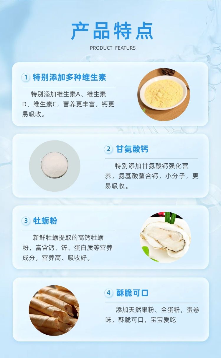 | 主要成分 | 牡蛎、甘氨酸钙、维生素D、维生素C |