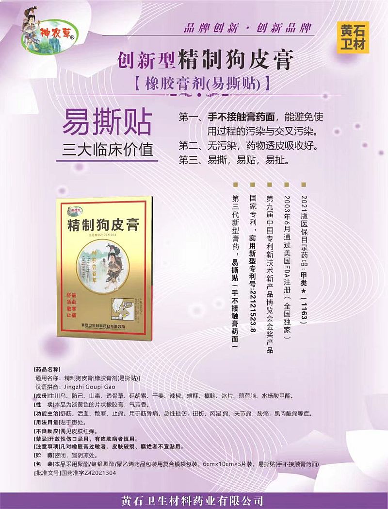 | 产品卖点 | 三大临床价值: 1.手不接触膏药面,能避免使用过程的污染和交叉污染。 2.膏药面无污染,药物透皮吸收好。 3.易撕、易贴、易扯。 |