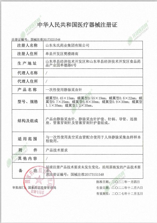 | 产品用途 | 与一次性使用真空采血管配合使用于人体静脉采集血样样本检验用。 |