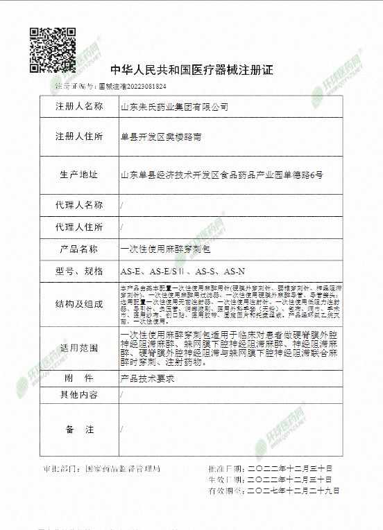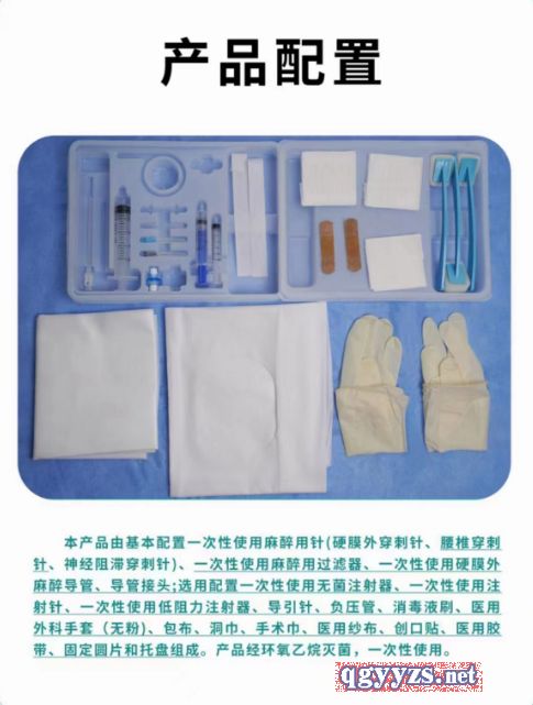 | 补充说明 | 本产品由基本配置一次性使用麻醉用针(硬膜外穿刺针、腰椎穿刺针、神经阻滞穿刺针)、一次性使用麻醉用过滤器、一次性使用硬膜外麻醉导管、导管接头;选用配置一次性使用无菌注射器、一次性使用注射针、一次性使用低阻力注射器、导引针、负压管、消毒液刷、医用外科手套(无粉)、包布、洞巾、手术巾、医用纱布、创口贴、医用胶带、固定圆片和托盘组成。产品经环氧乙烷灭菌,一次性使用。 |