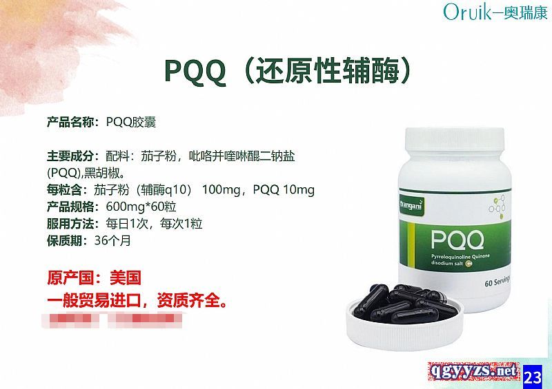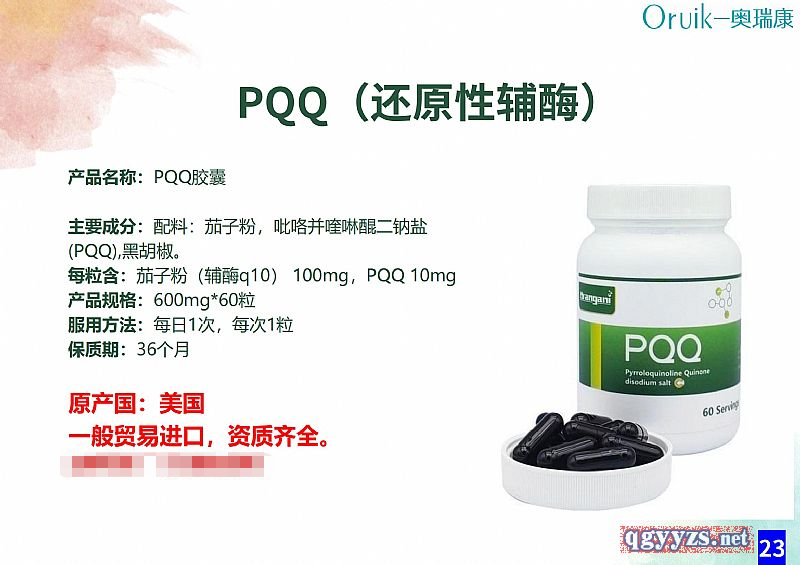 | 补充说明 | 产品名称:PQQ胶囊 主要成分:配料:茄子粉,吡咯并喹啉醌二钠盐(PQQ),黑胡椒。 每粒含:茄子粉(辅酶q10) 100mg,PQQ 10mg 产品规格:600mg*60粒 服用方法:每日1次,每次1粒 保质期:36个月 原产国:美国 一般贸易进口,资质齐全。 |