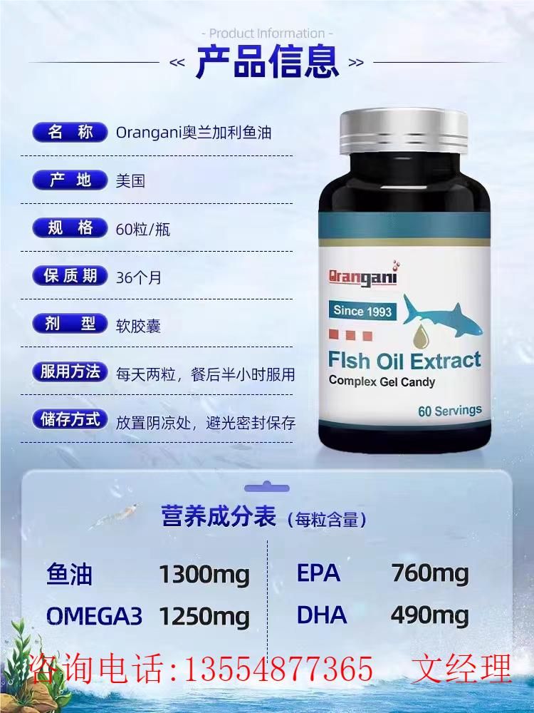 | 主要成分 | 每粒含鱼油提取物1300mg,提取欧米伽-3脂肪酸1250mg,EPA760mg,DHA490mg |
