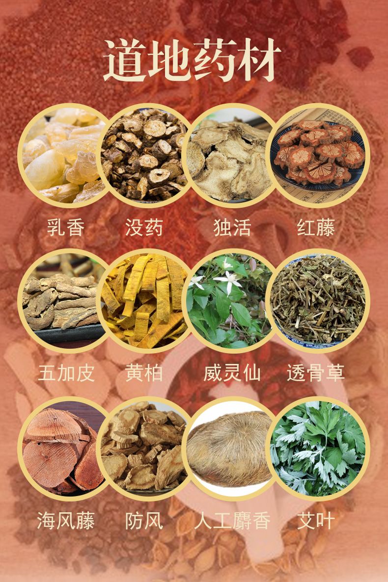 | 主要成分 | 本品是以乳香、没药、独活、红藤、五加皮、黄柏、威灵仙、透骨草、海风藤、防风、人工麝香、艾叶等为主要原料,经特定工艺加工而成。 |