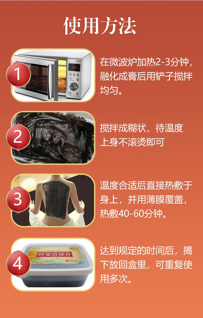 | 用法用量 | 在微波炉中加热2-3分钟,融化成膏后用铲子搅拌均匀,温度合适后直接热敷于身上,并用薄膜覆盖,热敷40至60分钟后揭下放回盒里,可重复使用。 |