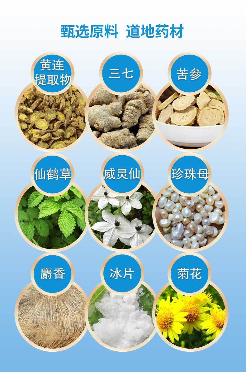| 主要成分 | 本品是以黄连提取物、三七、苦参、仙鹤草、威灵仙、冰片、珍珠母、麝香、元明粉、硼砂、菊花等为主要原料,经特定工艺加工而成。 |