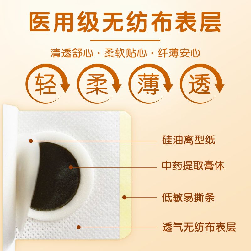 | 使用方法 | 外用,揭去防粘纸,贴于大椎穴:依健康需要,可在双足涌泉穴进行辅助贴敷:每贴贴敷6-10个小时,每日1-2次,两次贴敷的间隔时间应不少于1个小时:贴敷前用温开水或生姜片将贴敷部位擦拭干净,贴敷后在膏体部位轻揉按压更佳。 |