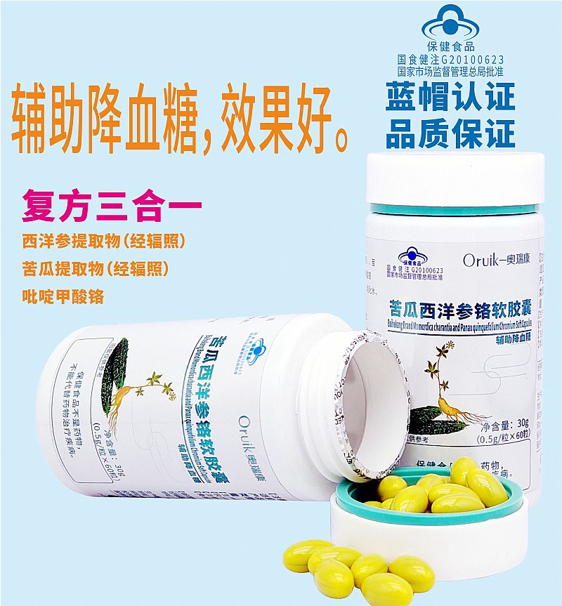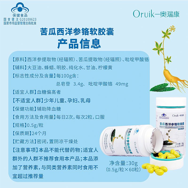 | 补充说明 | 【原料】西洋参提取物(经辐照)、苦瓜提取物(经辐照)、吡啶甲酸铬 【辅料】大豆油、蜂蜡、明胶、纯化水、甘油、柠檬黄 【标志性成分及含量】每100g含:总皂苷3.4g、吡啶甲酸铬49mg 【适宜人群】血糖偏高者 【不适宜人群】少年儿童、孕妇、乳母 【保健功能】辅助降血糖 【食用方法及食用量】每日2次,每次2粒,口服 【规格】0.5g/粒 【保质期】24个月 【贮藏方法】密闭,置阴凉干燥处 【注意事项】本品不能代替药物;适宜人群外的人群不推荐食用本产品;本品添加了营养素,与同类营养素同时食用不宜超过推荐量 |
