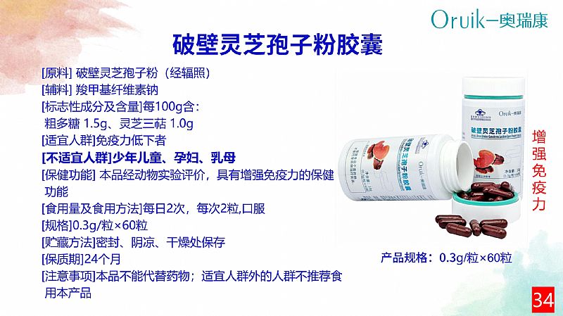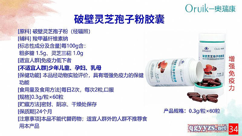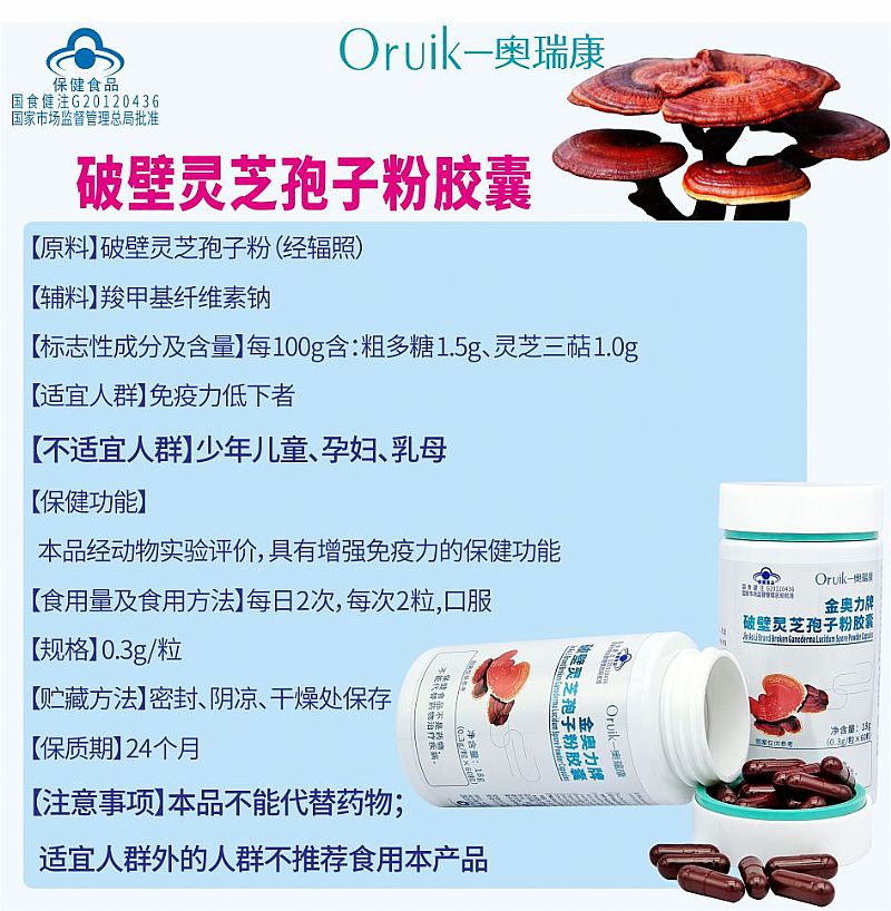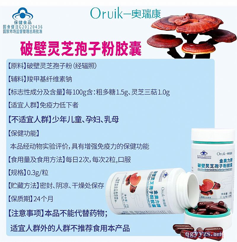 | 补充说明 | 【原料】破壁灵芝孢子粉(经辐照) 【辅料】羧甲基纤维素钠 【标志性成分及含量】每100g含:粗多糖 1.5g、灵芝三萜 1.0g 【适宜人群】免疫力低下者 【不适宜人群】少年儿童、孕妇、乳母 【保健功能】本品经动物实验评价,具有增强免疫力的保健功能 【食用量及食用方法】每日2次,每次2粒,口服 【规格】0.3g/粒 【贮藏方法】密封、阴凉、干燥处保存 【保质期】24个月 【注意事项】本品不能代替药物;适宜人群外的人群不推荐食用本产品 |