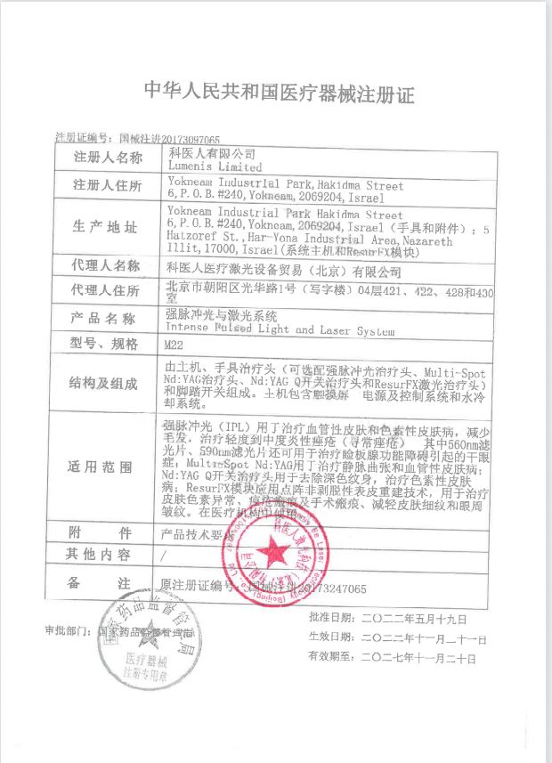 | 补充说明 | M22 Universal IPL现在与AOPT相结合,使高级用户能够完全控制,从而可以轻松地为每个患者和每种情况单独定制设置。充分利用每一次脉冲,轻松为您的患者提供一致、可靠的临床结果! 凭借黄金线设计,Lumenis自豪地向美容医疗市场推出一款优质的M22版本,提供**、安心、有效的光和激光治疗。 |